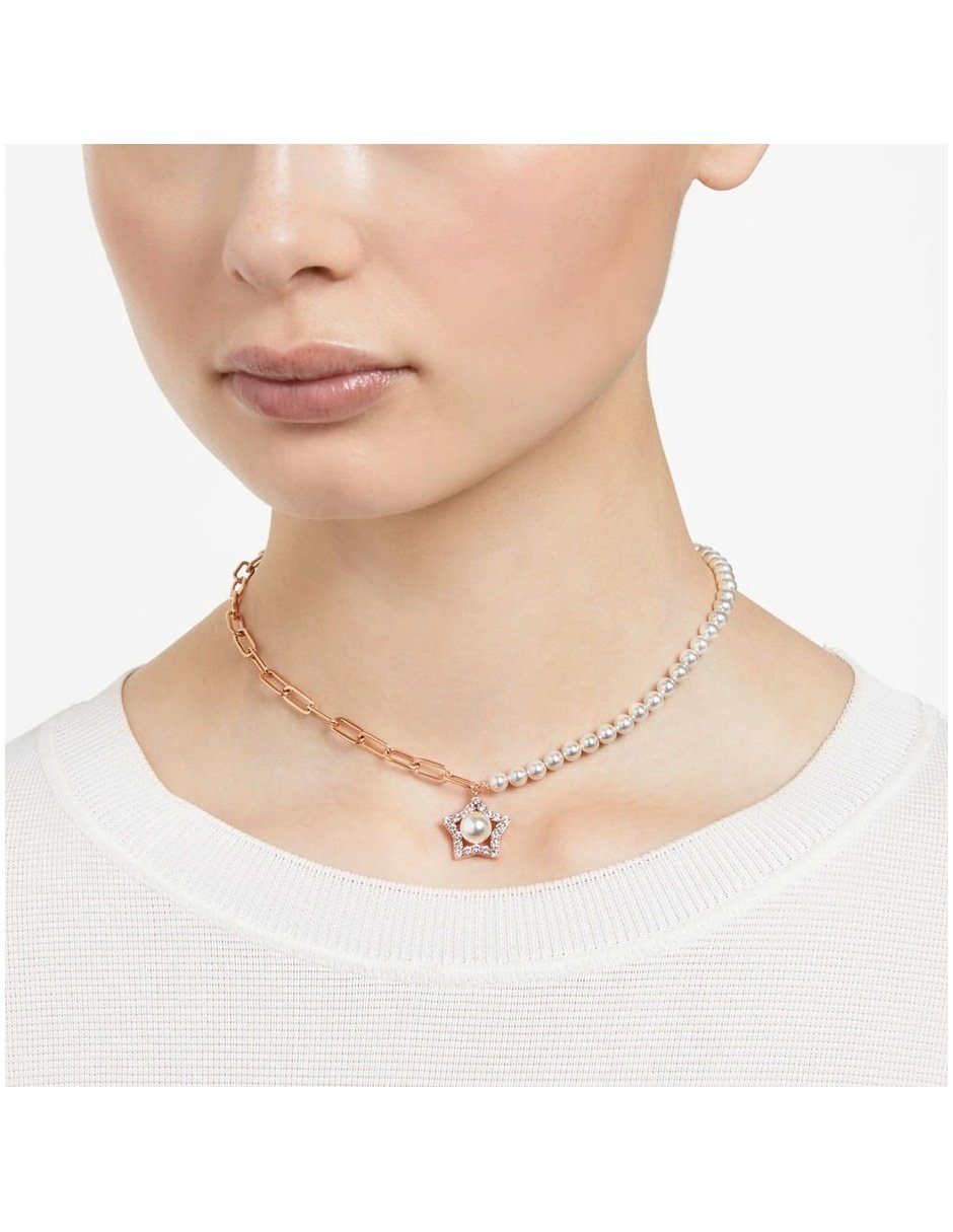 Consigue un estilo maravilloso con este delicado colgante de la familia Stella. Con una elegante combinación de perlas de cristal y brillantes piedras acabadas con un baño en tono oro rosa, este diseño asimétrico atraerá todas las miradas. Llévalo solo y prepárate para brillar.